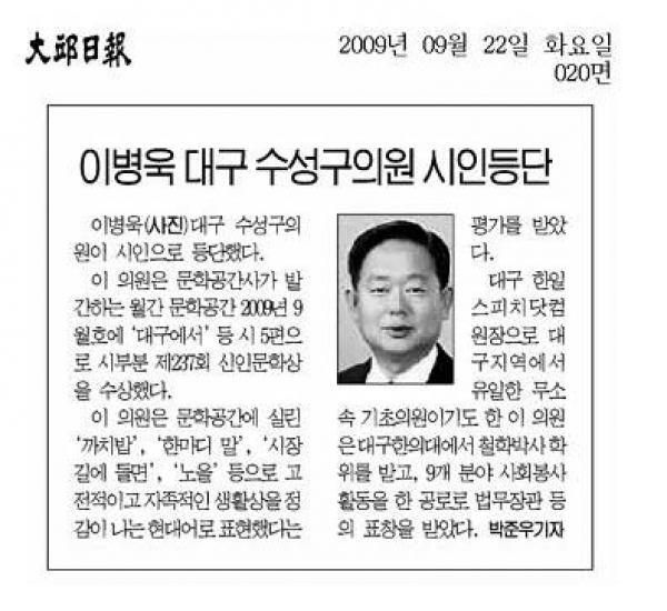 대구일보- 이병욱 수성구의회 의원 시인등단