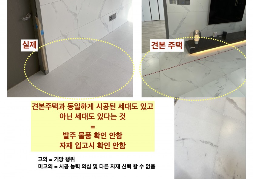 특히거실바닥타일이모델하우스와다른타일이시공된곳이태반이라공분을사고있습니다.
