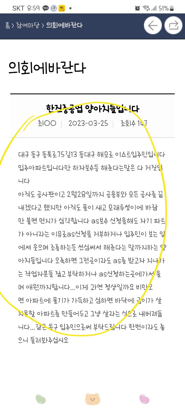 수성구 파동에 지어지고 있는 해모로하이엔 아파트 입주 예정자입니다. 공사가 늦어지는 것 같아 사전점검 연기를 계속 요구하며 민원을 넣었으나 결국은 지난 11일부터 오늘(13일)까지 강행했습니다. 사검하러 아파트 들어가는 순간부터 온통 공사판(흙더미 등)이었습니다. 겉은 이래도 내부는 똑바로 해두었겠지 라고 믿으며 세대앞에 선 순간부터 충격은 시작되었습니다. 벽과 문에 페인트가 묻어있고 오염돼 있었고 안에 들어가니 온통 먼지투성이에 욕실 변기에 뚜껑도 없고 욕실장은 흔들흔들 거실 테두리 마감 안돼서 넓은 틈새가 보이고 샤시 창문 닫을때 창틀 흔들리고(우레탄폼 안넣음), 거실 바깥 난간은 나사로 고정안돼서 흔들흔들, 그외 주방 가구 미설치, 강마루 방바닥 삐걱거림등 세대별 하자 수가 100개는 넘을 정도로 부실 공사 자체였습니다. 사검 기일에 맞춰 대충 부실공사 할 것 같아서 사검연기를 그렇게 요청했지만 결국은 예상대로였습니다. 일부세대는 거실 타일이 모하랑 다르게 시공되었다고 합니다. 힘들게 한푼 두푼 모아 새집 입주하려했으나 이젠 절망만 남았습니다. 제발 수성해모로하이엔 아파트 오셔서 눈으로 확인하시고 완벽 시공 후 점검을 한번 더 하게 해 주시고, 사검 허가를 내준 수성구청에도 강력히 책임소재를 따져 주십시오. 아파트 사전 점검은 모든 시공이 완료된 후에 이루어져야 하며 공사중에 먼지 뒤집어쓰며 덜된 집을 보는 것이 아닙니다. 참고로 동대구해모로하이엔 입주민에 의하면 한진건설 행태가 뻔히 보입니다.(첨부파일참조) 저희 입주예정자 모두 미래의 우리 모습이 될 것을 두려워하고 있고, 이것을 막기 위해 글을 씁니다.