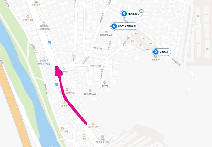 또한 '수성더팰리스 푸르지오더샵'은 대단지로 여러블럭을 끼고 있습니다. 단지 중간의 더 넓은 골목을 두고 왜 하필이면
