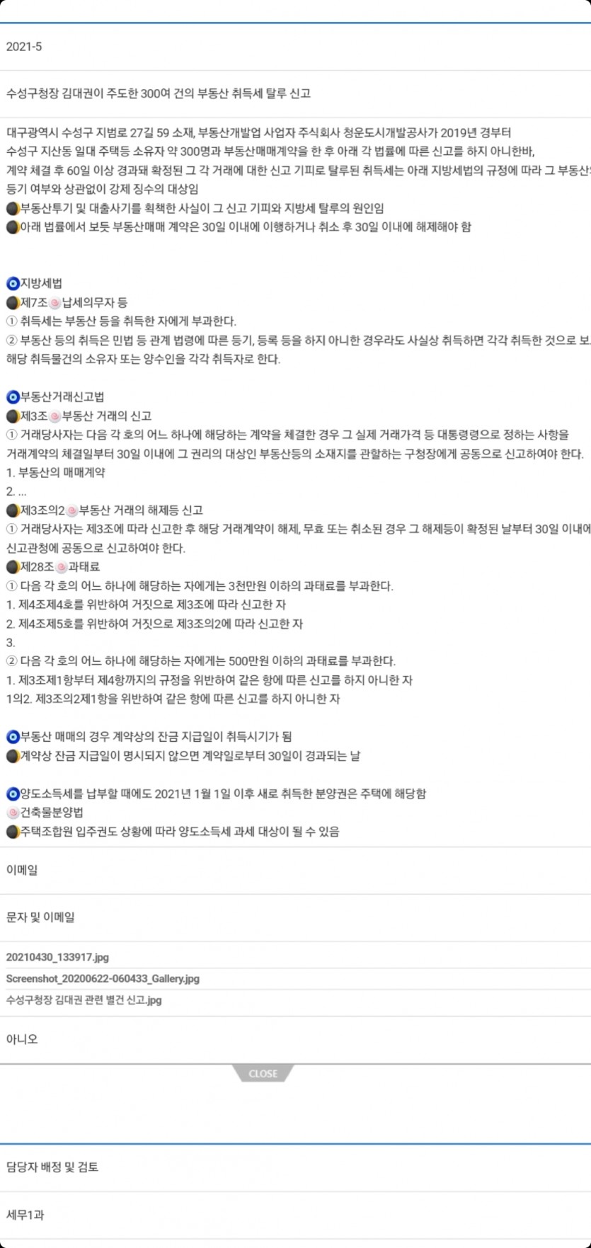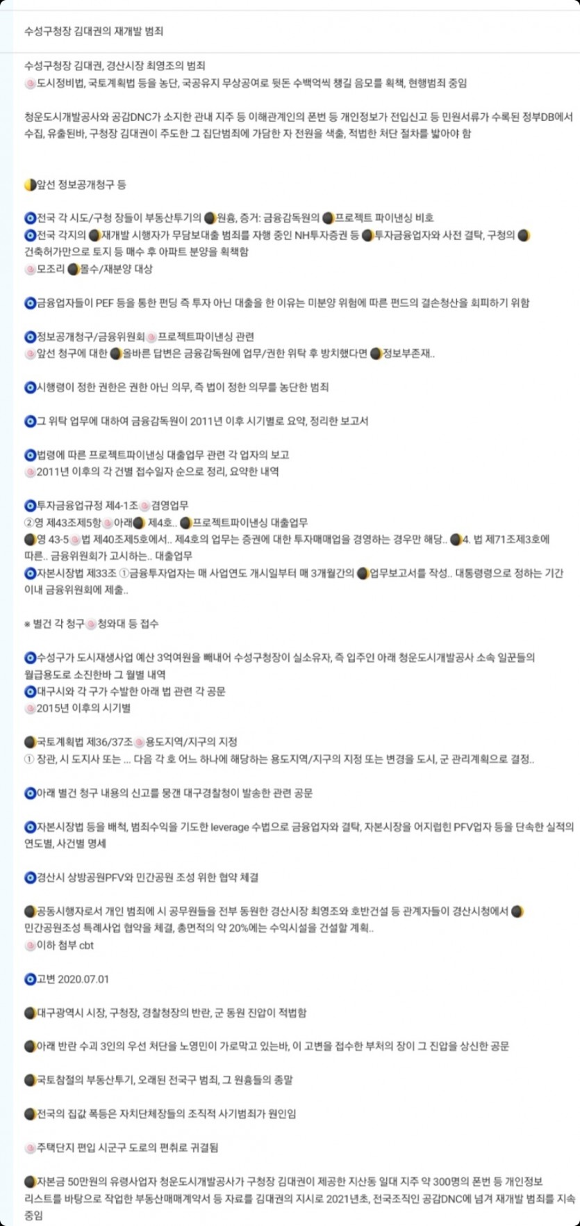 수성구청장 김대권의 재개발 범죄, 지산동 주택등 부동산매매계약 약 300건 체결...